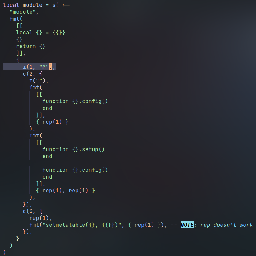 Hi, I'm trying to make a snippet for a Lua module. However, I'm not sure how to repeat the highlighted node with index 1 from the previous / upper level (not in the same curly brace). Is there a way I can achieve this? |