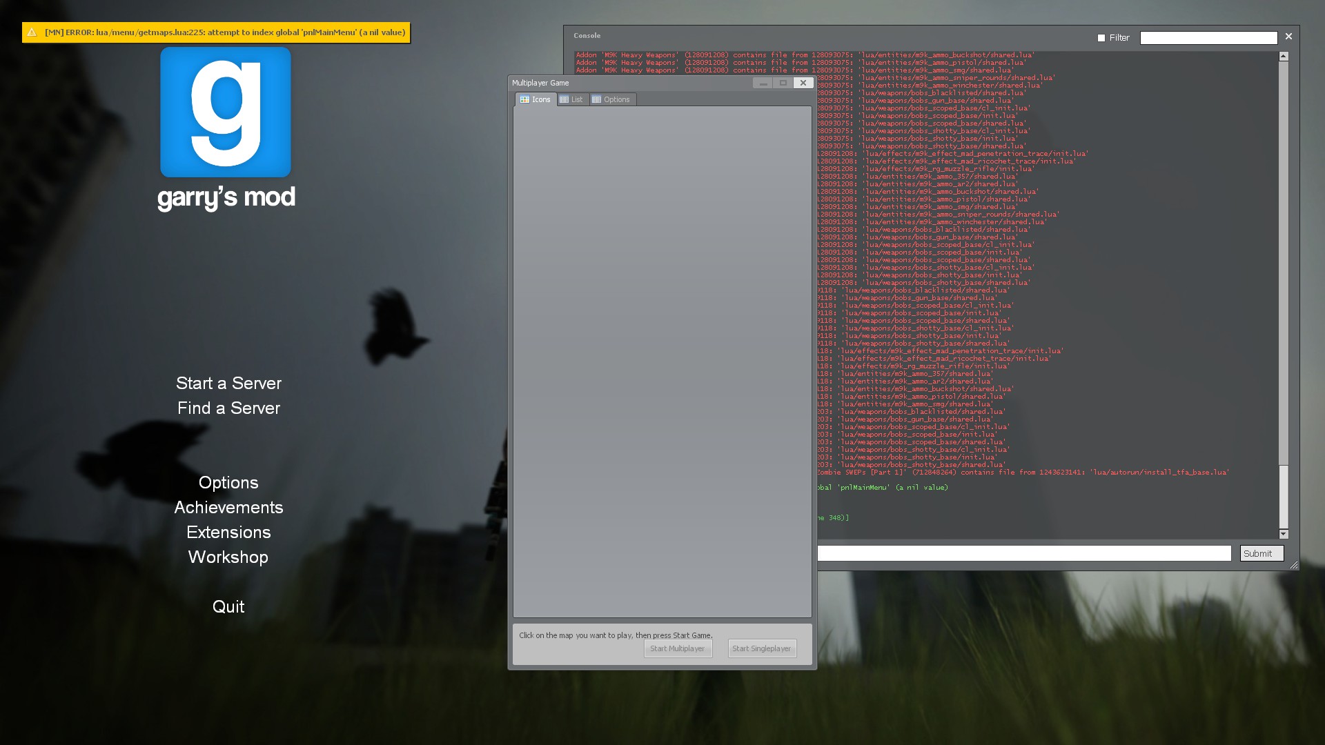 I keep getting a messagebox on startup talking about getmaps.lua. The error seems to be why I am unable to play singleplayer with this dll. Deleting the old files I installed from code_lua, verifying integrity of game cache, then reinstalling this dll hasn't fixed this.