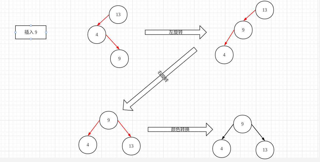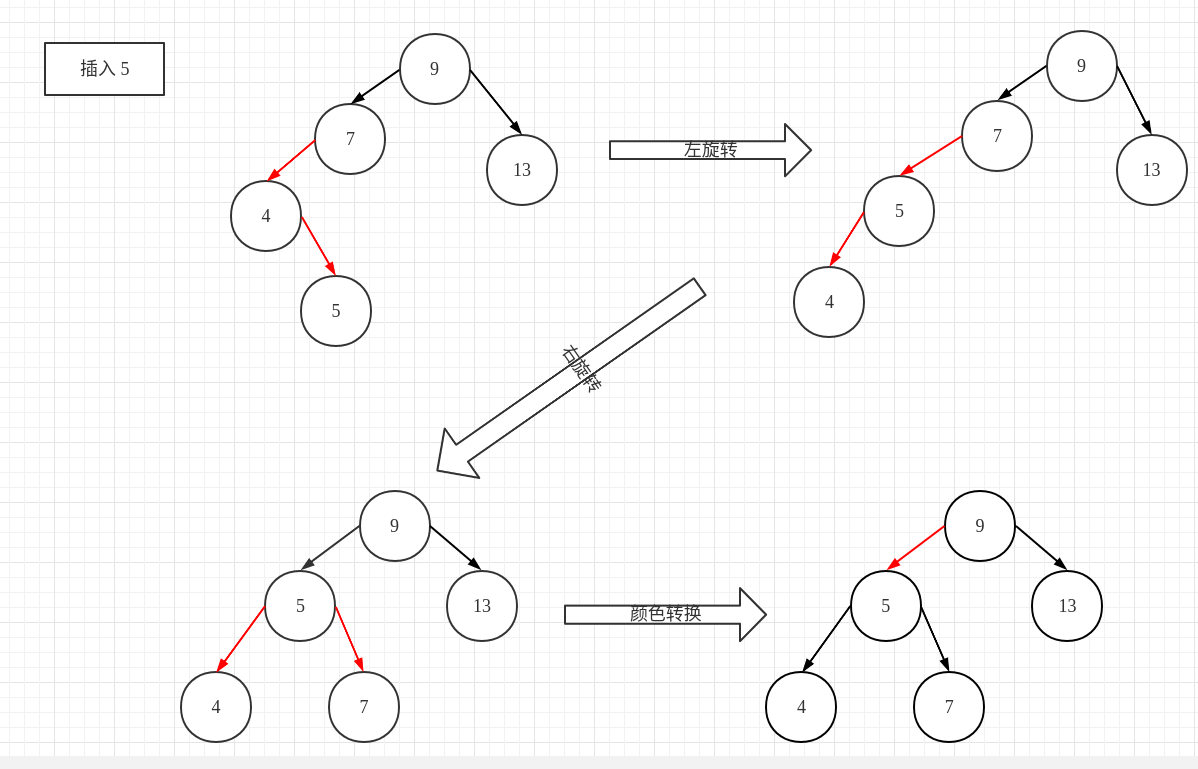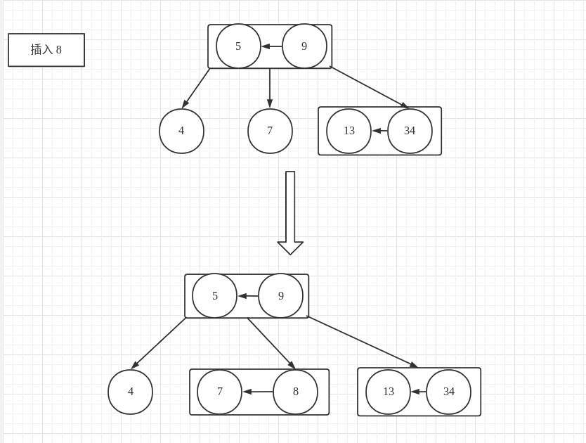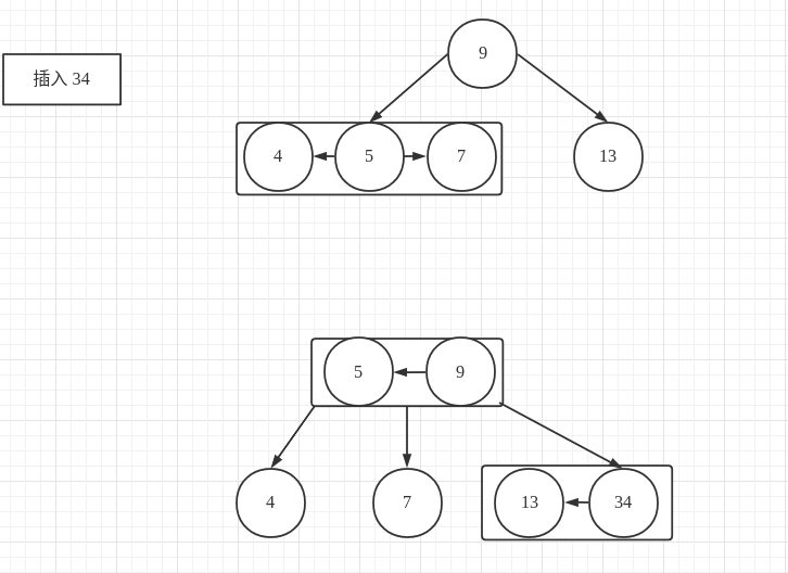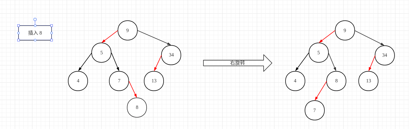 }以插入 {13, 4, 9, 7, 5, 34, 8, 6} 节点为例,大致的插入流程如下图所示: