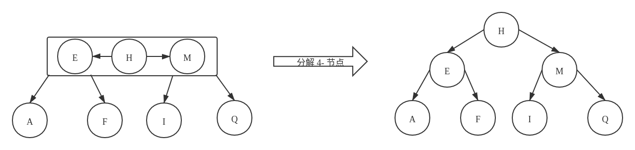 给出的解决方案是再引入一个 4- 节点 的临时节点来处理 3- 节点 添加节点的情况,但是这种节点在我们的树中是不能够存在的(允许临时存在)。一旦出现了 4- 节点,就要立刻对它进行分解,将它拆分为三个 2- 节点。
