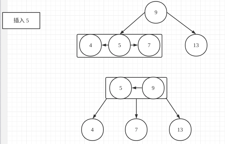 2-3 树:插入 5 到 4、7 节点组成的 3- 节点 中,使得这个 3- 节点成为一个4-节点,然后进行分解,分解后的父节点将会与根节点组合成为一个新的 3- 节点