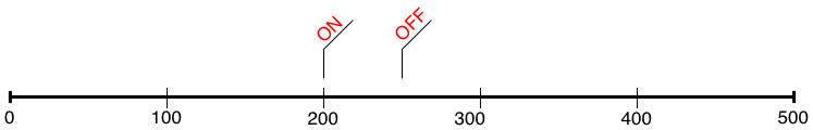 When the schedule table is executed action ON is processed at 200 and OFF at 250. When the date reaches 500, the schedule table restarts at 0, so ON is processed again at date 700 and OFF at date 750 and so on.