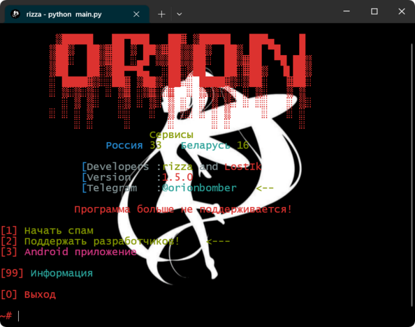 УстановитьTermuxpkg upgrade -ypkg update -ypkg install gitpkg install python -ypip install --upgrade pipgit clone https://github.com/Lucky1376/ORION-Bombercd ORION-Bomberpip install -r requirements.txtpython main.py