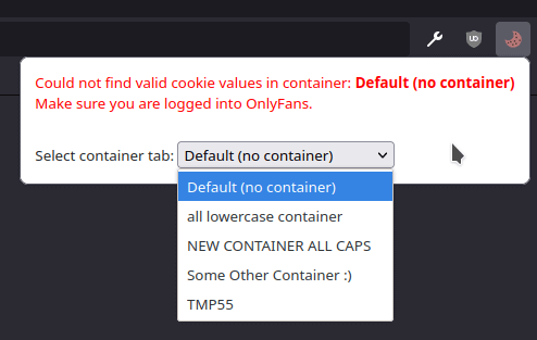 - Firefox only: If you use the container tabs feature in Firefox the addon now supports selecting what container tab to get the cookies from.