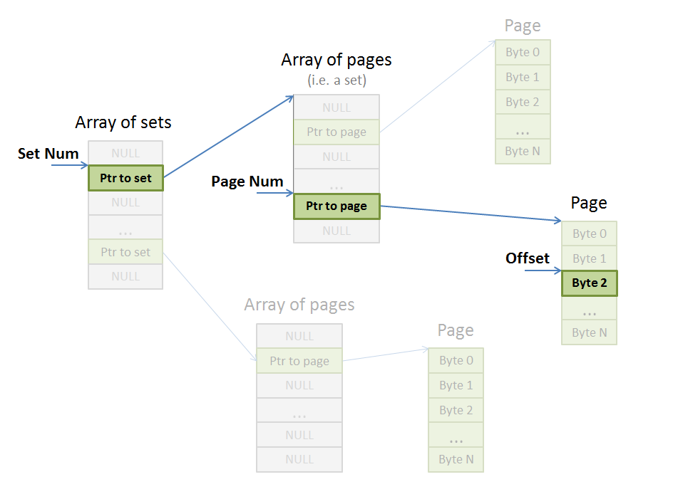 The values of set number, page number and offset can be extracted directly from the memory address. The following picture shows the address separating: