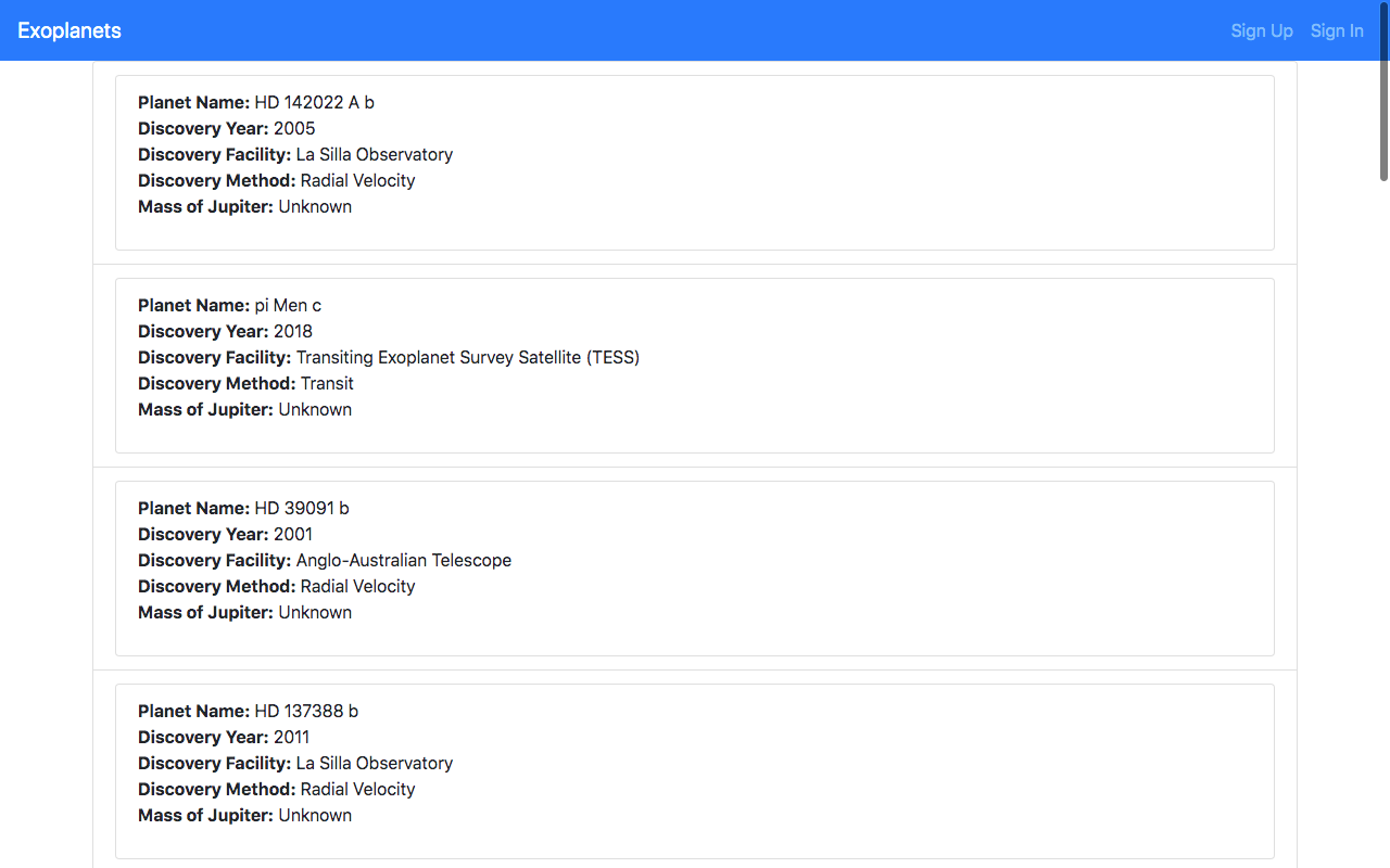 Exoplanet is an application that uses Nasa's public API information to access and obtain data on all confirmed exoplanets. Users can then keep track of any exoplanet by adding them to a personal list of favorites. Add as many to your list as you need, along with a tag to remember them by!
