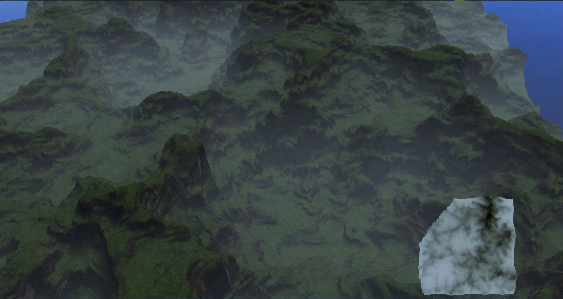 - Fog is generated on the fragment shader as a function of distance to camera and altitude.