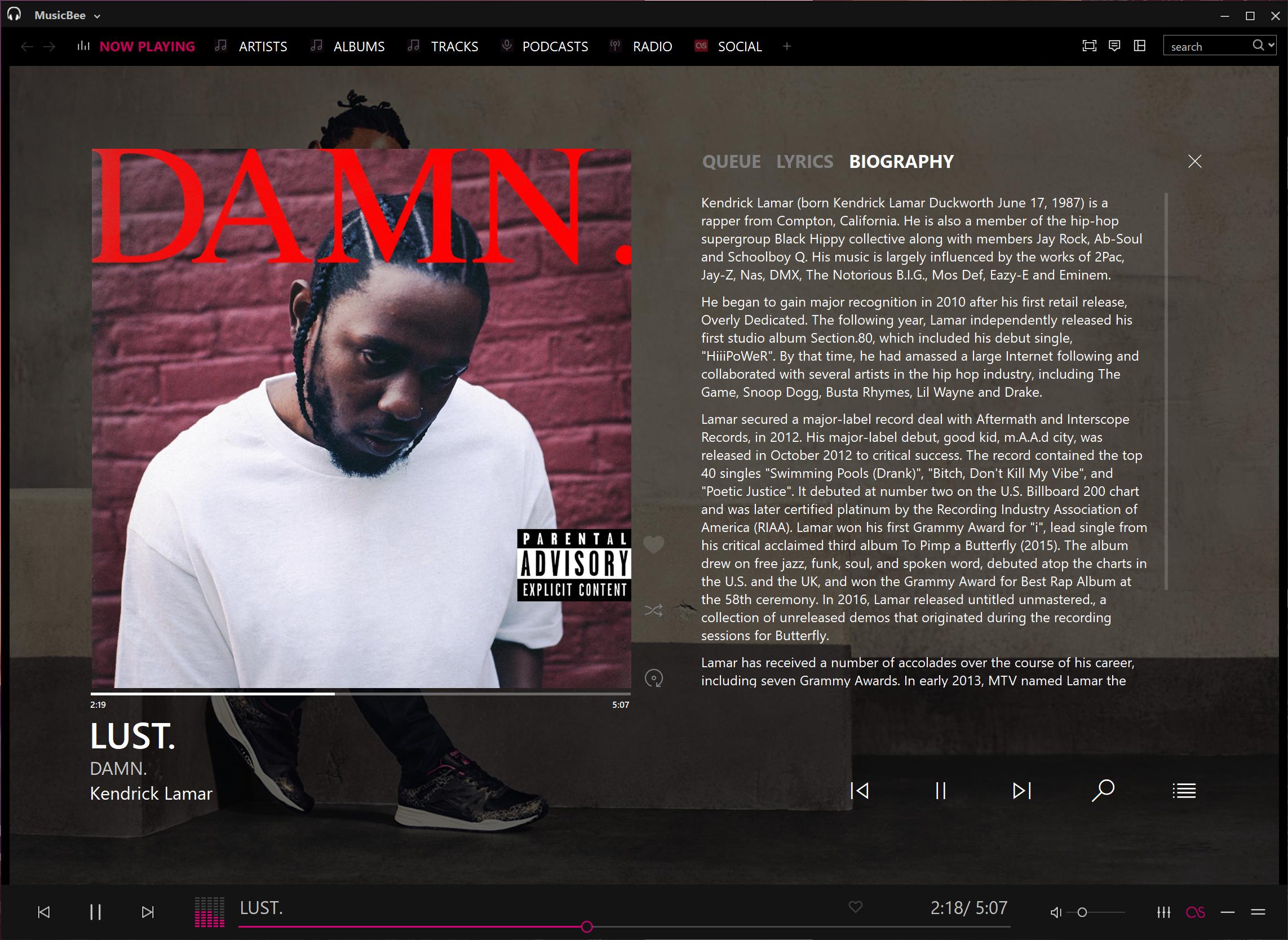 - More button: Reveals the music queue, lyrics, and artist biography.