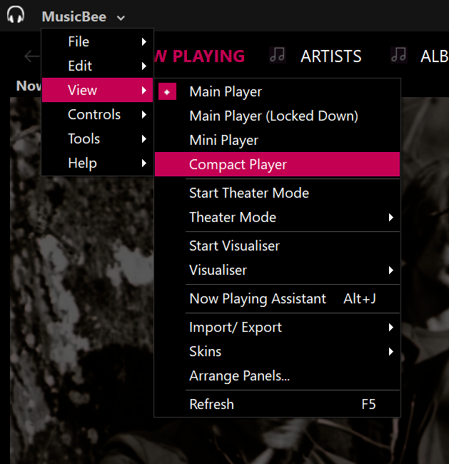 The Compact Player view floats the music player in a small window. You can access Compact Player from the View menu: