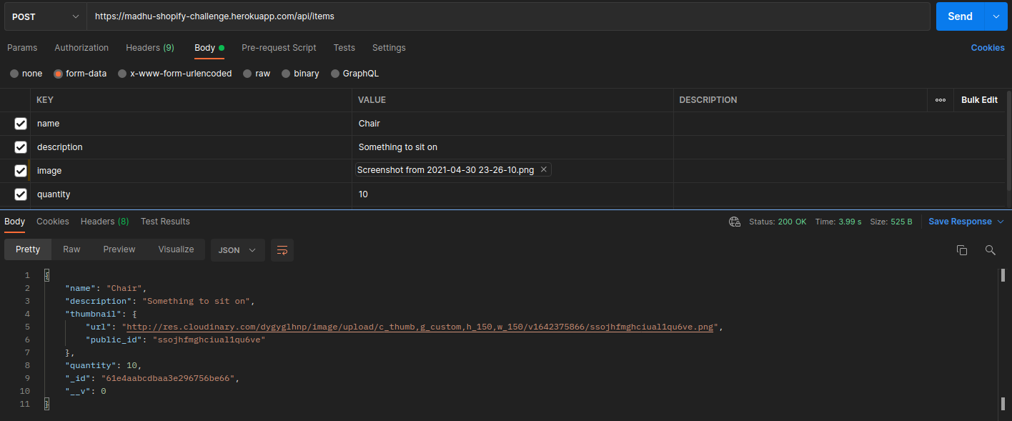 POST /api/items Accepts a request with Content-Type: multipart/form-data with required text inputs of name, description, and quantity. It also requires a file input of image. Middleware validation confirms that all inputs fit required criteria (name and description are strings of at least length 1, quantity is a positive integer and image is an image type file). If successful, the endpoint will return the Item object which will contain all the listed string fields as well as a thumbnail field which will link to the generated cloudinary thumbnail. Invalid inputs will return a 400 error with an array of all errors.