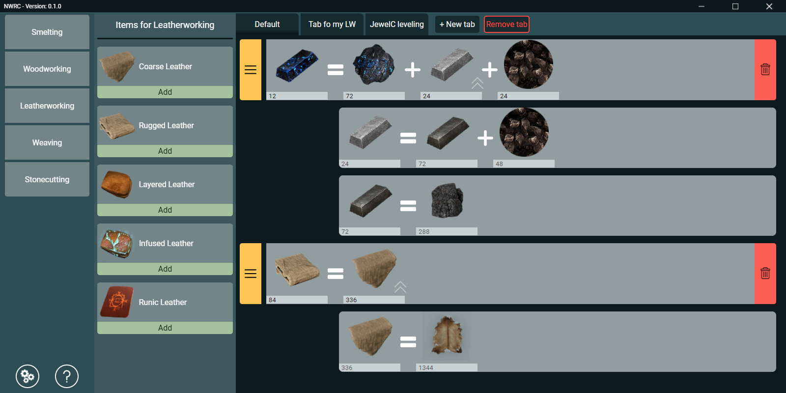 NRWC is a Windows desktop app that do the maths part of the refining process of New World with a bit of ergonomy added to it. The main rule while developping it was and is KISS! (Keep It Stupid Simple) without giving away some useful features and a decent GUI.