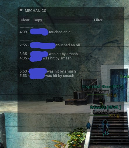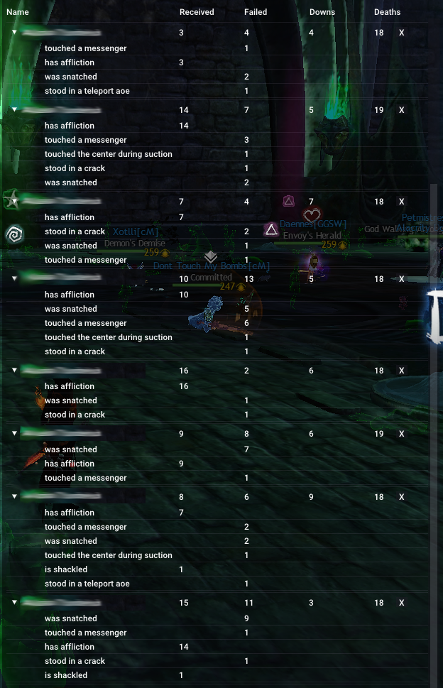 I’ve been working on a plugin for ArcDPS using its realtime combat api. The plugin shows a realtime list of failed mechanics for players. The mechanics are determined by the skill id of the attack a player/npc is hit by. It shows a timestamp in ‘min:sec’ since entering combat and ‘X was hit by Y mechanic’.