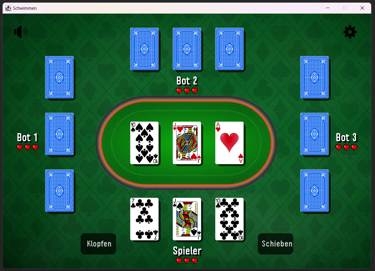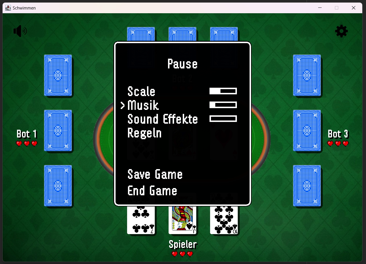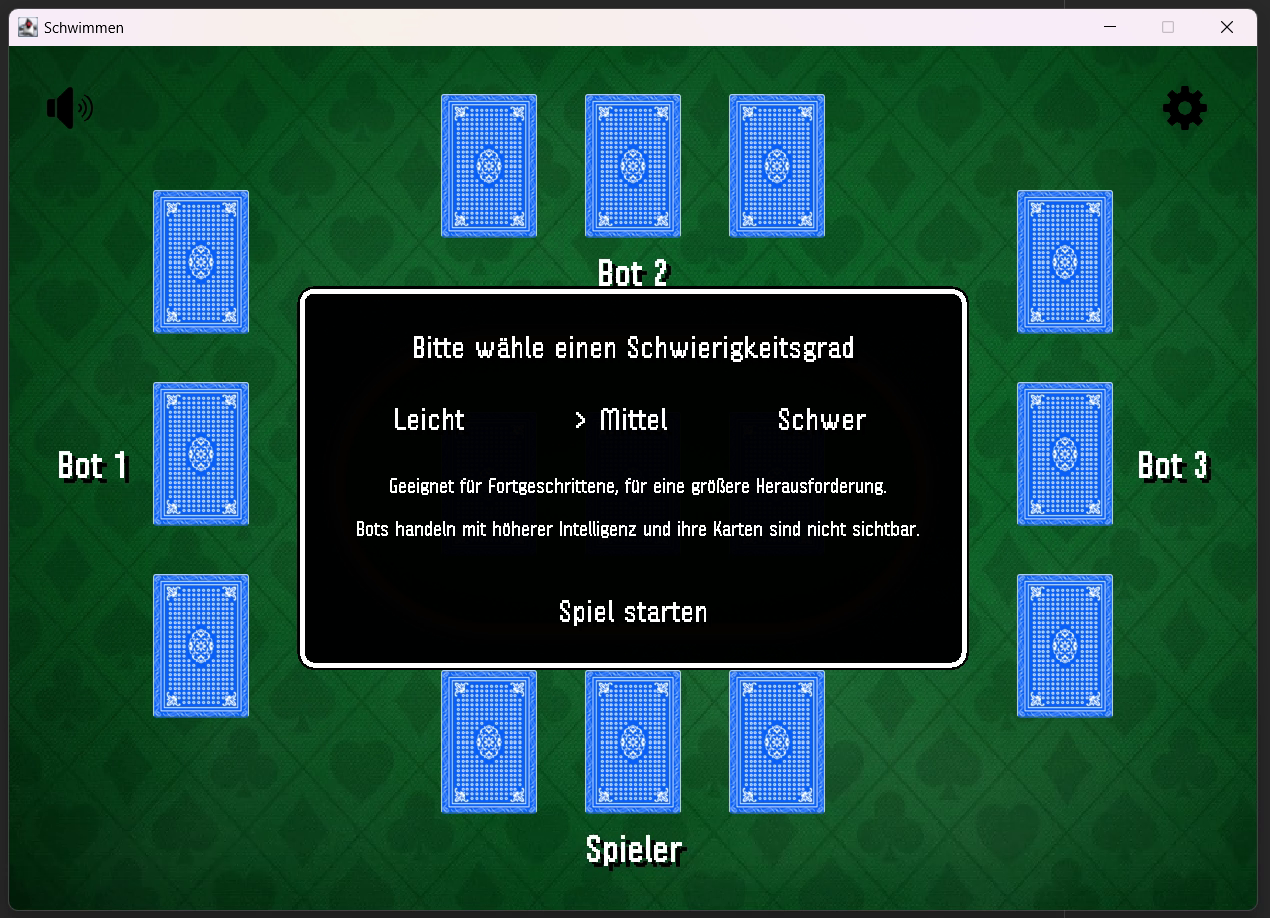 A game programmed in Java. The game is called 'Schwimmen' and is a card game. You can play against 3 AI opponents. There are 3 difficulty levels.
