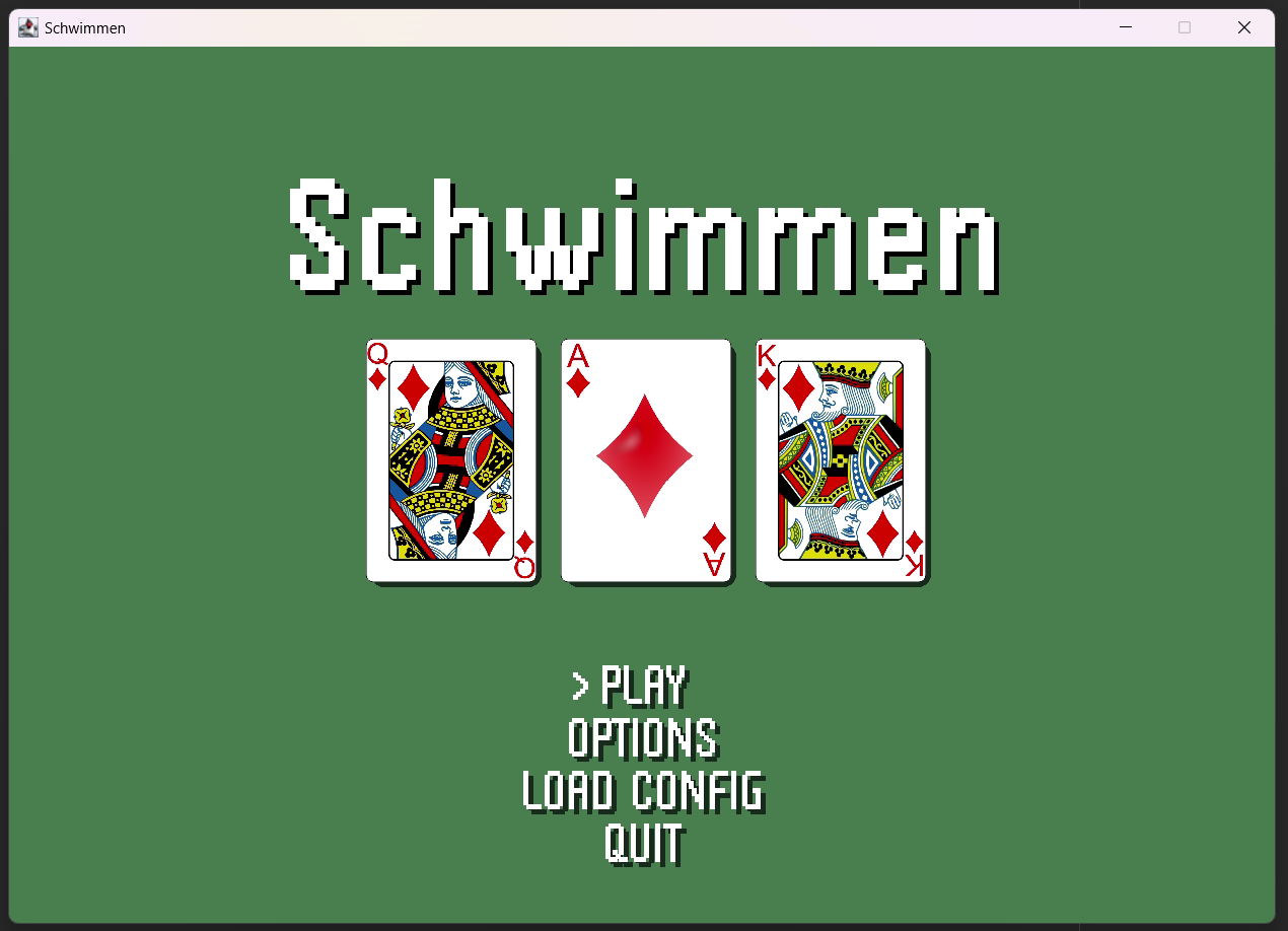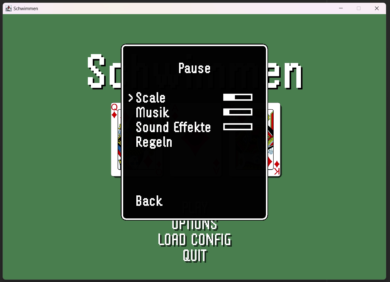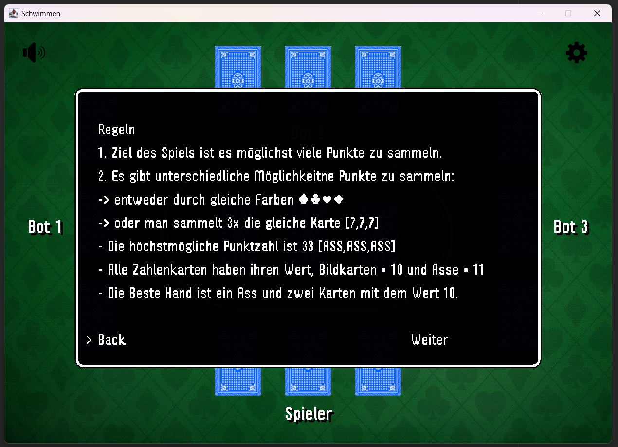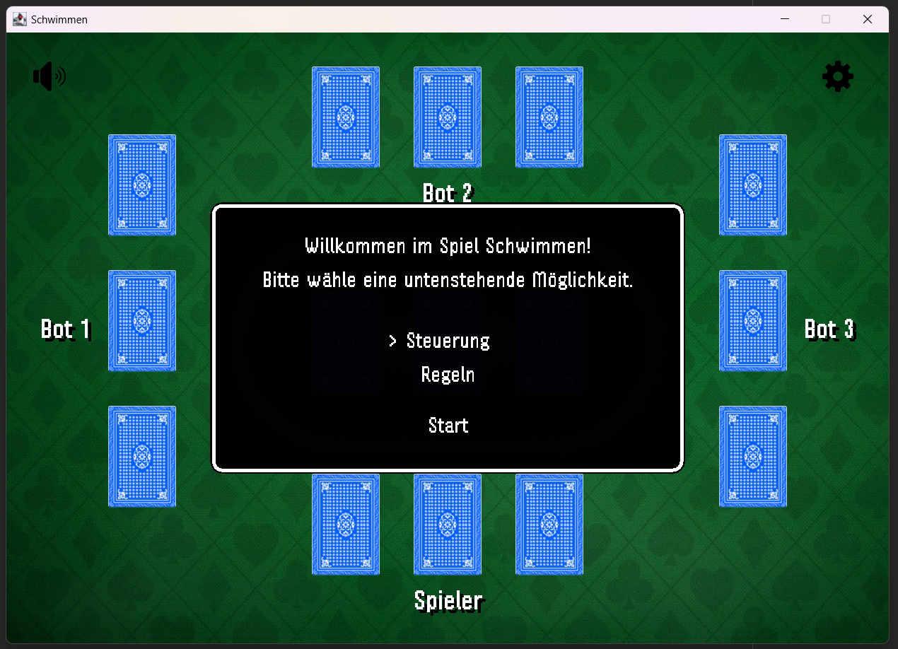 A game programmed in Java. The game is called 'Schwimmen' and is a card game. You can play against 3 AI opponents. There are 3 difficulty levels.