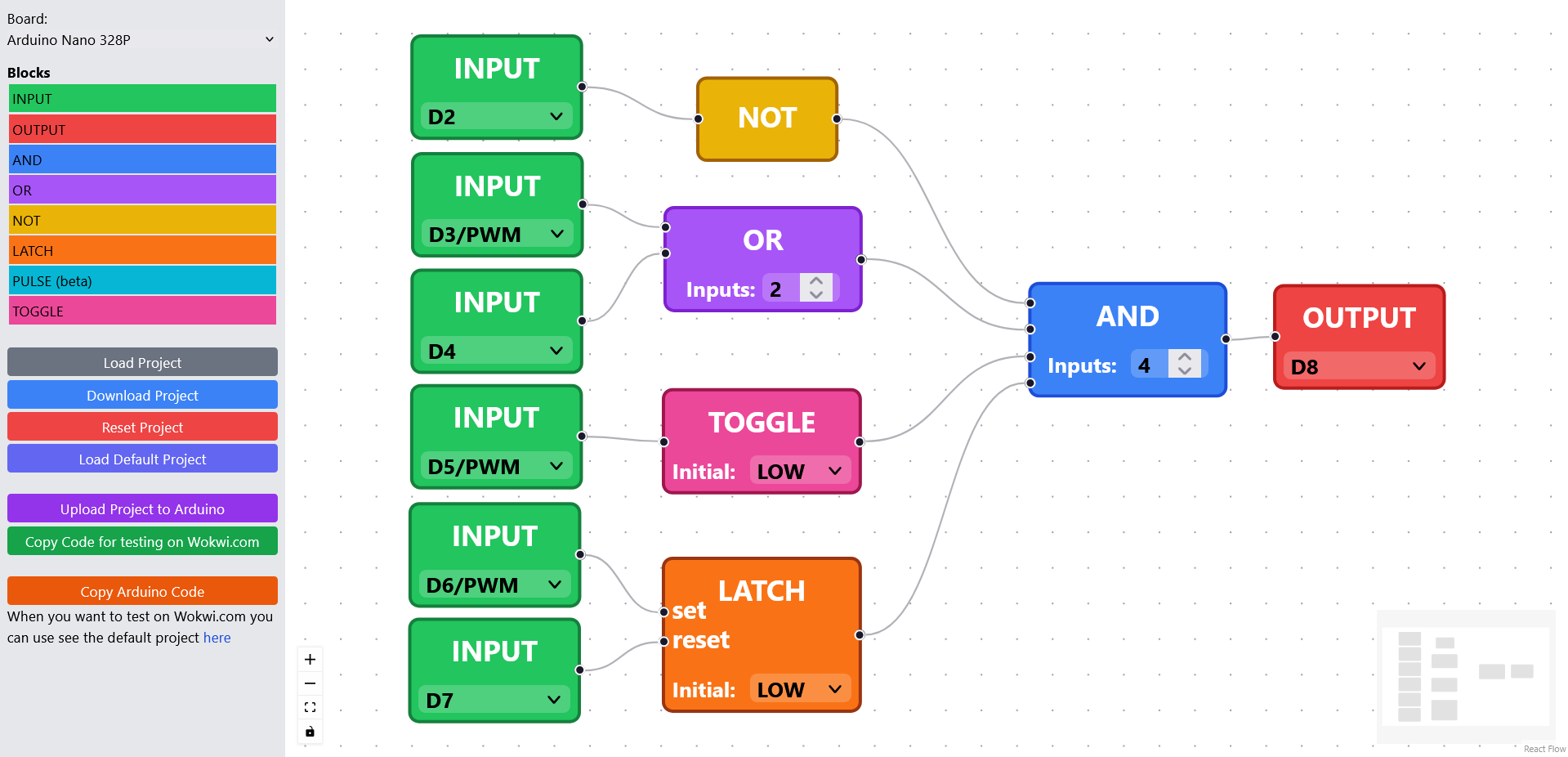 A visual programming interface for Arduino controllers built with React and React Flow. This project allows users to create logic circuits using a block-based interface and generates optimized bytecode for Arduino microcontrollers.