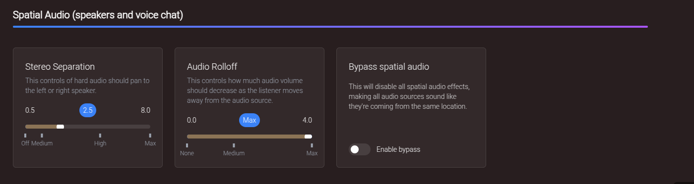 Added new customization options - letting you change how strong you want the stereo effect to be, more granular control over volume roll-off (how quiet audio becomes over distance), and one quick instant toggle to instantly disable spatial audio at all (affecting speakers and voicechat)