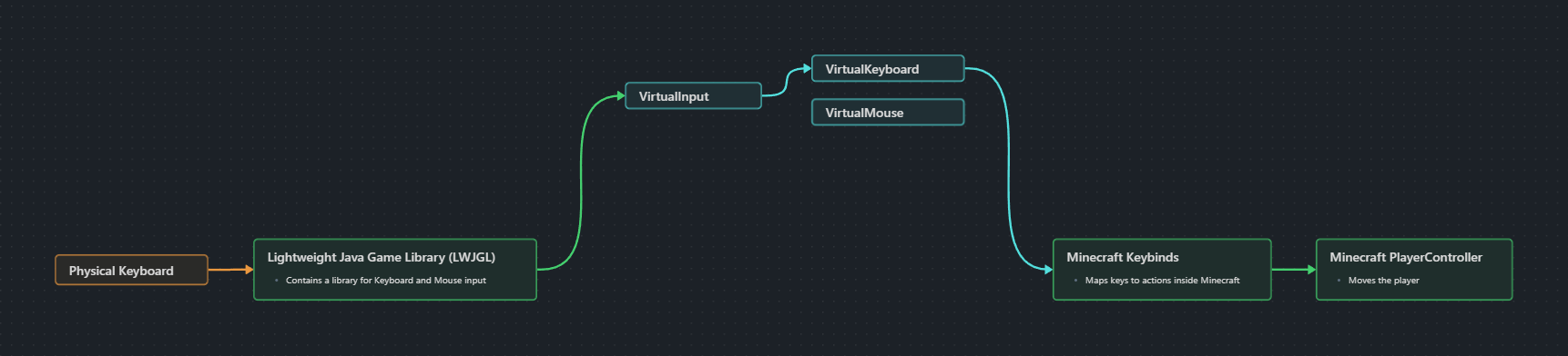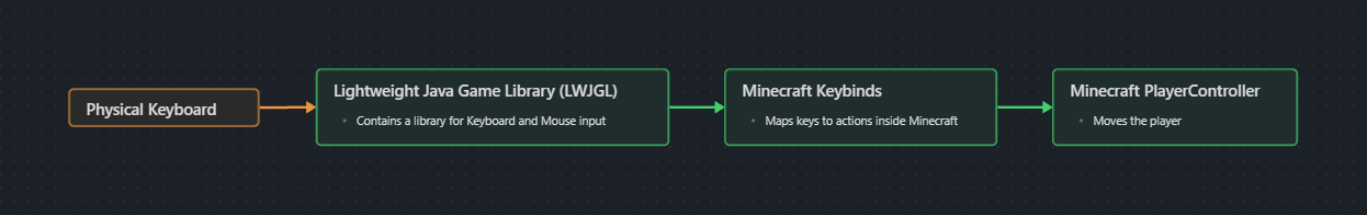This takes us to the target that we have chosen for our Input System. With this we have full control over Mouse and Keyboard, can support Gui screens and modded keybinds. Plus this method only pretends to be a keyboard inside of Minecraft so it will not have access to other programs.