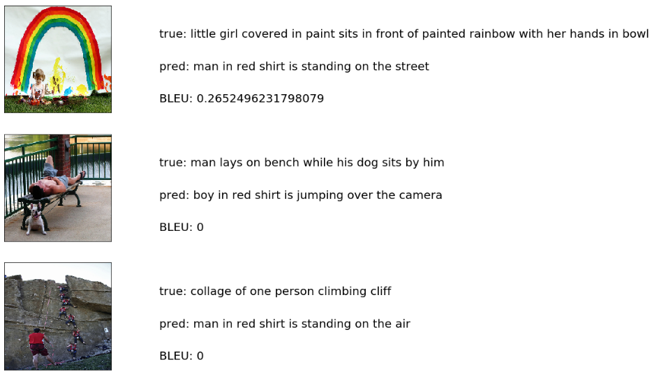 These generated captions are compared to the actual captions from the dataset and evaluated using BLEU scores as the evaluation metrics. A score closer to 1 indicates that the predicted and actual captions are very similar. As the scores are calculated for the whole test data, we get a mean value which includes good and not so good captions. Some of the examples can be seen below: