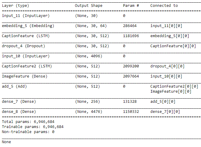 The step involves building the LSTM model with two or three input layers and one output layer where the captions are generated. The model can be trained with various number of nodes and layers. We start with 256 and try out with 512 and 1024. Various hyperparameters are used to tune the model to generate acceptable captions