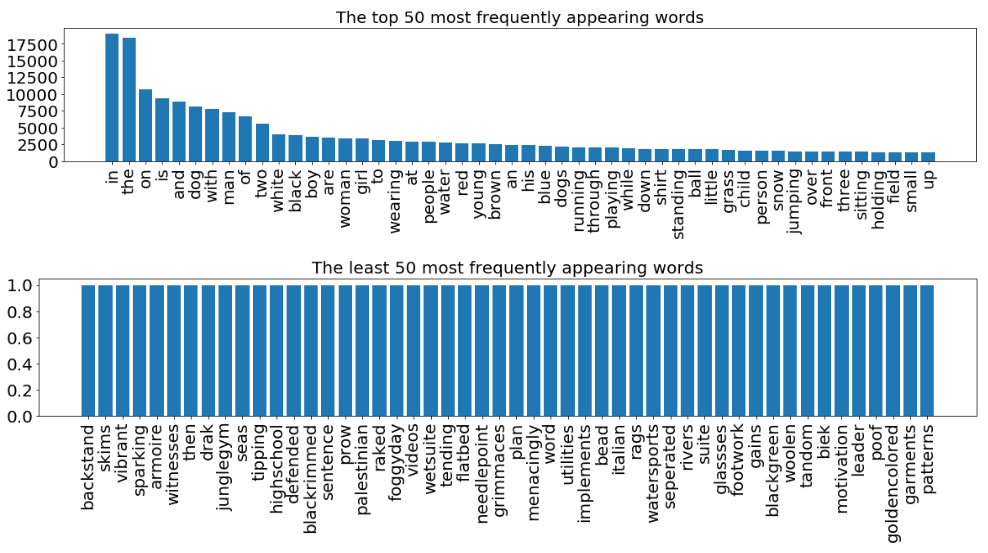 This is the first step of data pre-processing. The captions contain regular expressions, numbers and other stop words which need to be cleaned before they are fed to the model for further training. The cleaning part involves removing punctuations, single character and numerical values. After cleaning we try to figure out the top 50 and least 50 words in our dataset.