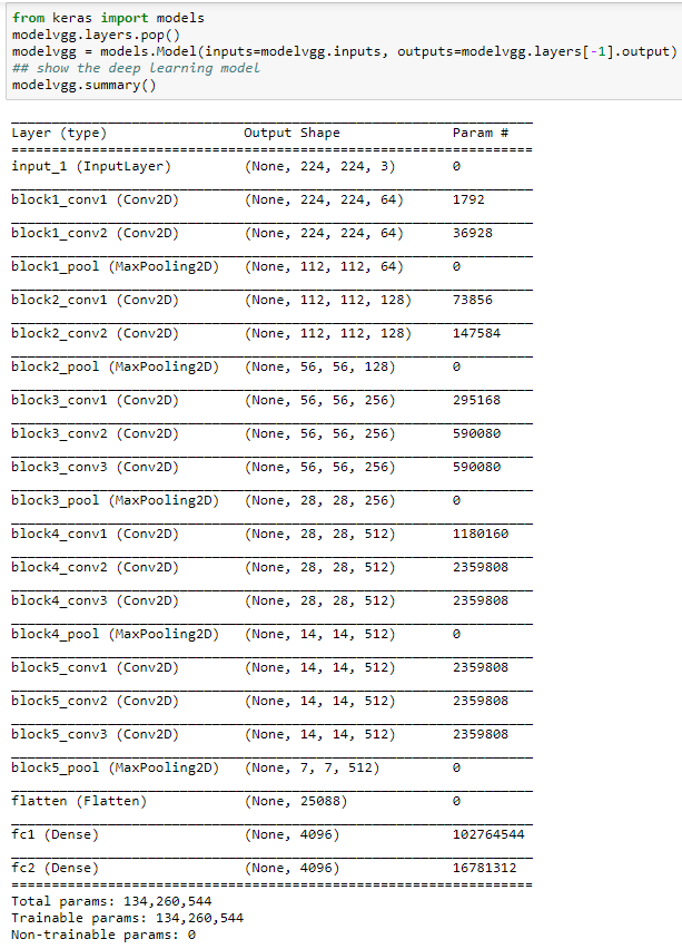 - Instead of using this pre-trained model for image classification as it was intended to be used. We just use it for extracting the features from the images. In order to do that we need to get rid of the last output layer from the model. The model then generates 4096 features from taking images of size (224,224,3).
