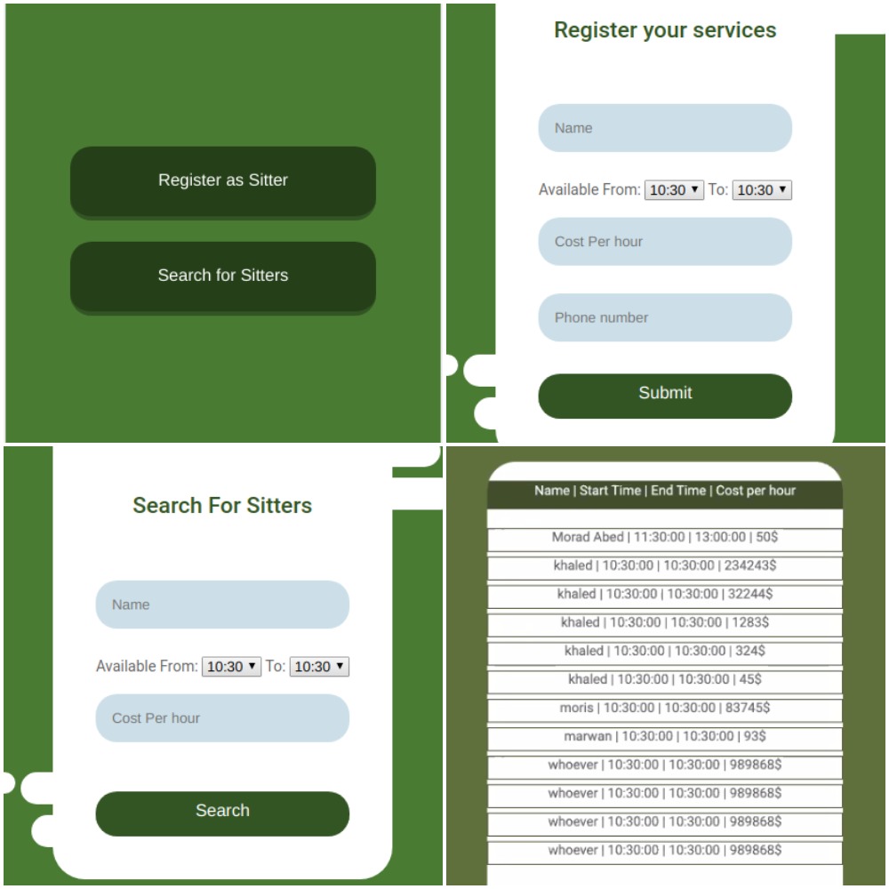 The app is very easy to use, no registeration needed for the users, they just have to enter their name and phone number, and then they can start searching for sitters, when they find one they can ask for reserve, and that will send an email for the sitter so he or she can contact their potential customer.