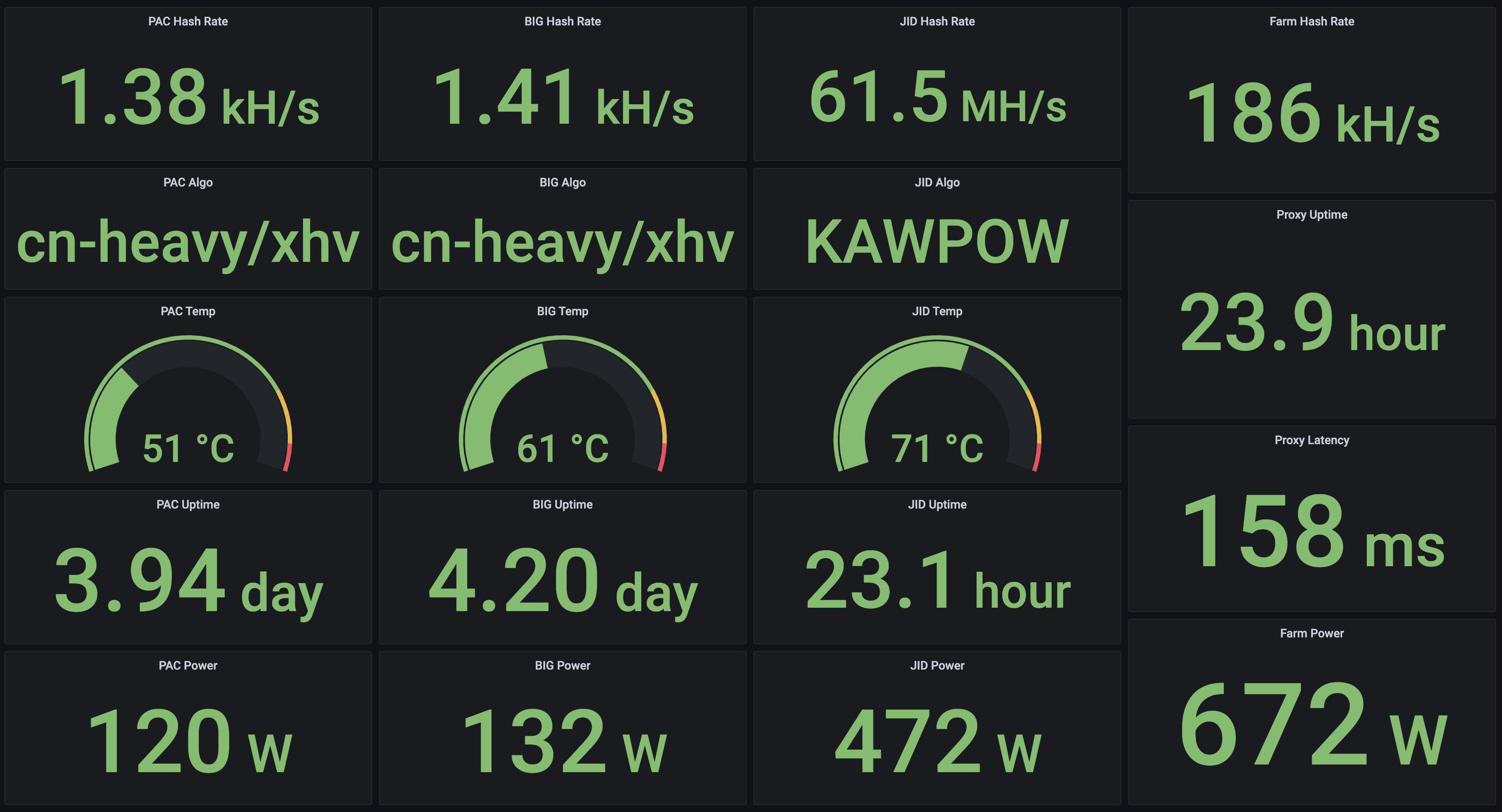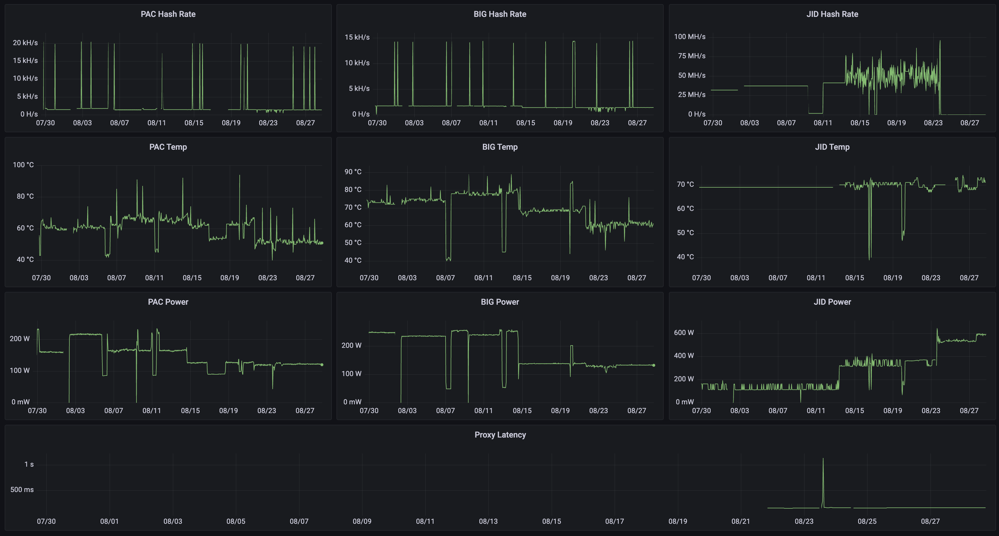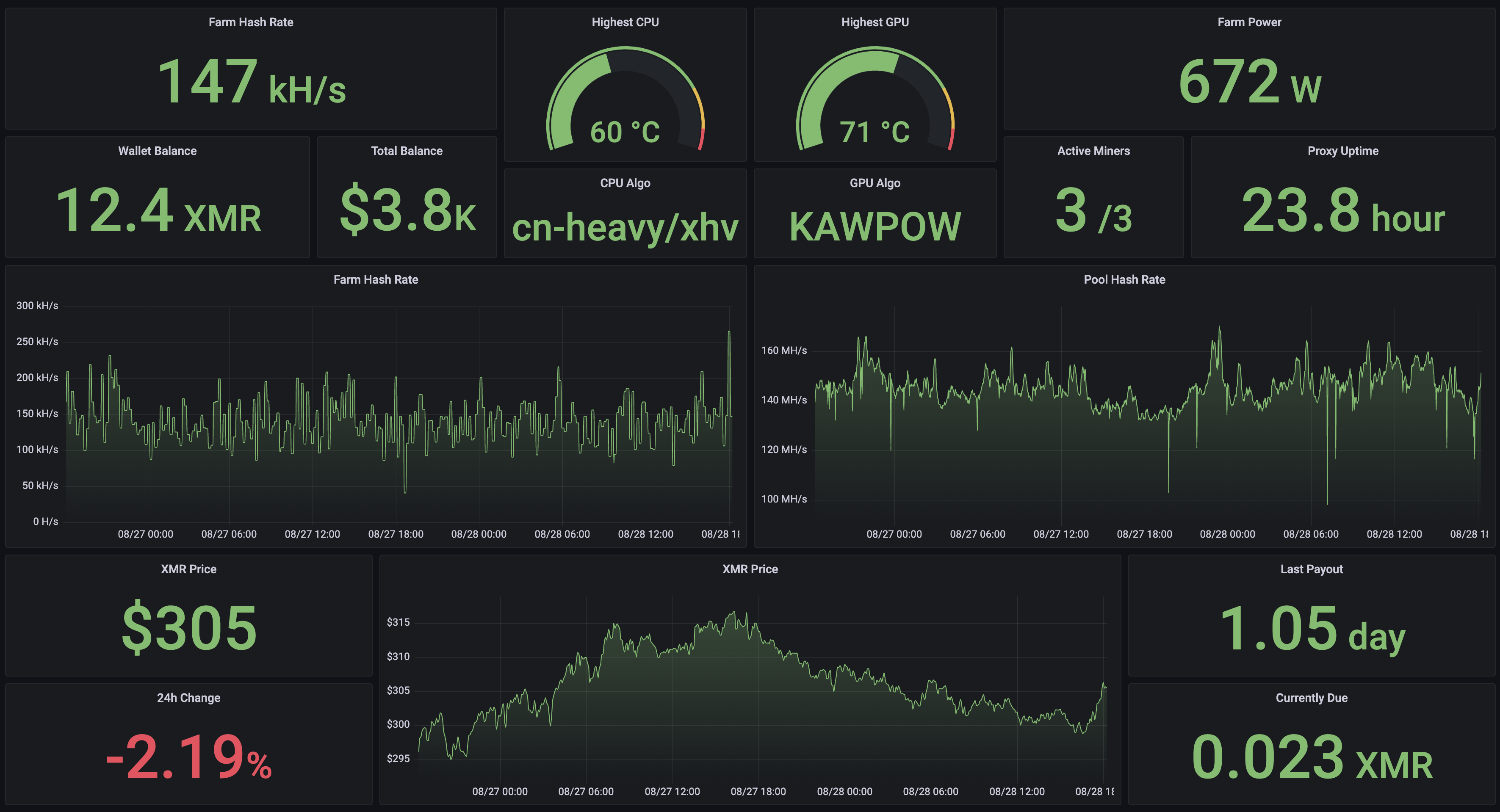 This repository contains bash scripts that scrape metrics from XMRig miners, XMRig proxies, GMiners, CoreTemp, the MoneroOcean pool, CoinMarketCap, Wemo Insight power plugs, and Monero wallets in order to write to InfluxDB for display on Grafana dashboards.