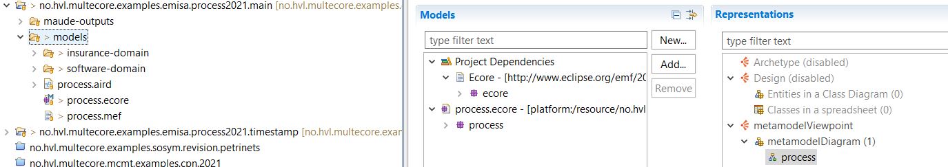 We encourage the reader to check MultEcore and MultEcore MCMTs main repositories webpages for an intuition on how MultEcore works and can be activated on a concrete project. Import all the projects within the Solution folder of this repository (three projects should have been imported: no.hvl.multecore.examples.emisa.process2021.main, no.hvl.multecore.examples.emisa.process2021.timestamp and no.hvl.multecore.mcmt.examples.emisa.process2021.main. Then activate MultEcore with the main project selected no.hvl.multecore.examples.emisa.process2021.main. If everything worked, one should see a tab where the structure of the multilevel hierarchy is shown (if this view is not shown one can open it in Window > Show View > Other... > MultEcore Views > Hierarchy View) and show something similar to: