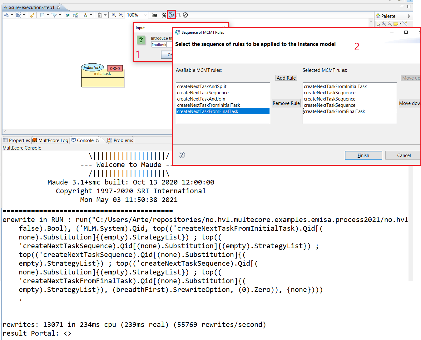 Select the corresponding icon (highlighted in the figure), and set the name of the new output model in the dialog. Then A wizard will appear where we can set the rules, the number of times each one should be applied and in which order. In the figure below, the example shown will produce a finaltask using the xsure-execution-step1 as initial model:
