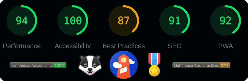 The badge creation is based on the Lighthouse-Badges repository [License: MIT; Copyright: © 2018 Emanuele Mazzotta; Changes: made] and the pagespeed badge on the Readme-Pagespeed-Insights repository [License: Apache-2.0; Copyright: © 2021 Ankur Parihar; Changes: made]. Check out both. They are magnificent and maybe better suited for your use case than the Lighthouse-Badger.