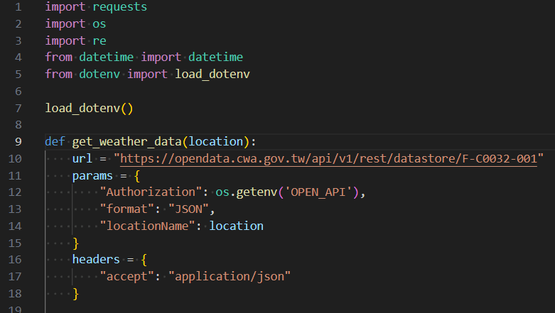 "Authorization": os.getenv('OPEN_API')這裡的 OPEN_API 也要一起改。 - .env 就叫 .env 就好,不要在前面亂加字