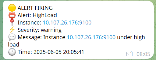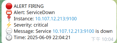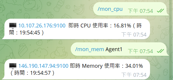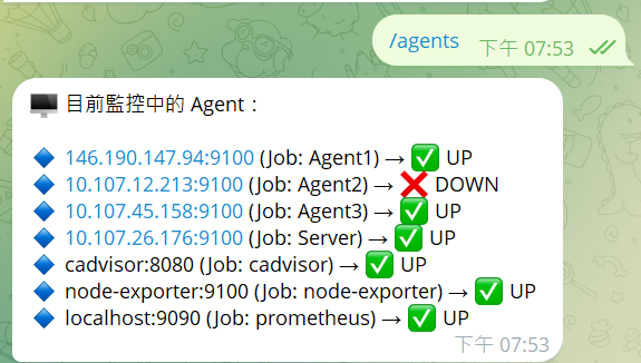 .env.example複製並取名叫.env# Telegram Bot Configuration BOT_TOKEN = your_telegram_bot_token_here chat_id = your_chat_id_here ALERT_CHAT_ID = your_alert_chat_id_here # Whitelist Configuration (user IDs) ALLOWED_USERS=123456789,987654321 # Server Configuration SERVER_HOST=0.0.0.0 SERVER_PORT=8002 SERVER_URL=http://localhost:8002 PROMETHEUS_URL=http://localhost:9090 - 增加 Agent:修改 agent_name_ip.txt