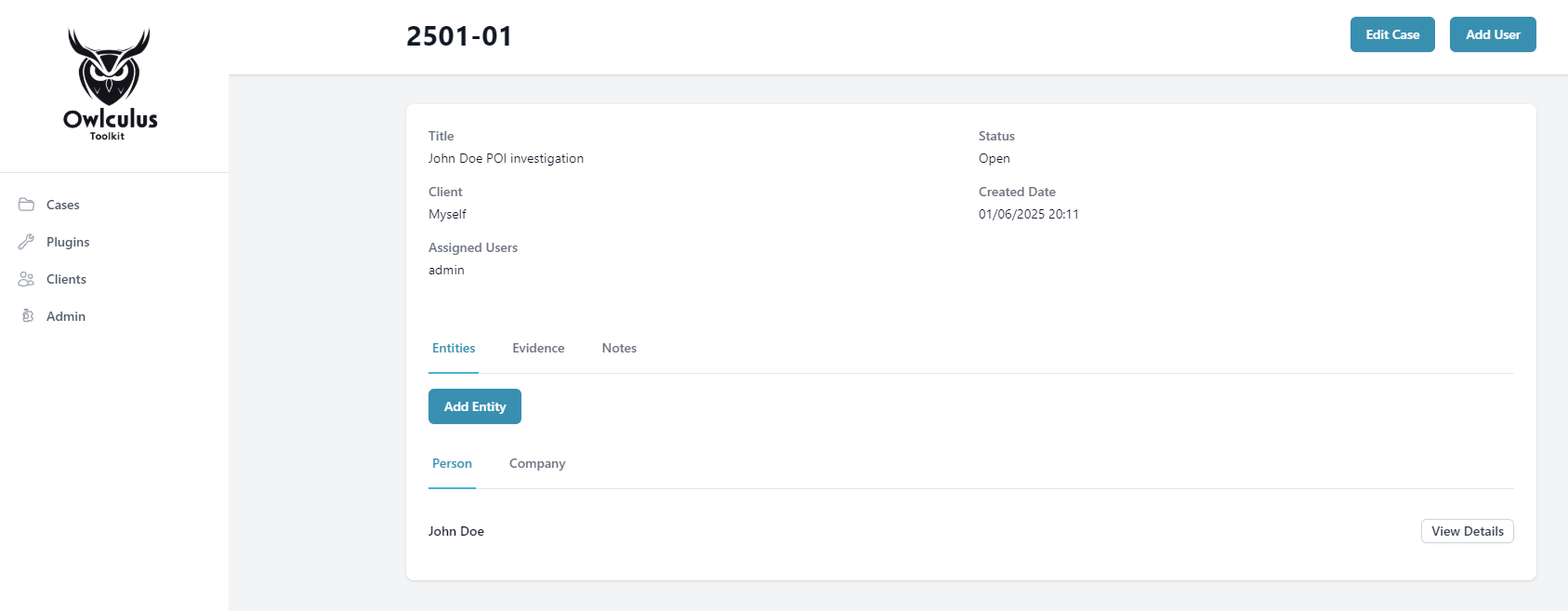 This is a key part of Owlculus functionality. Rather than define the case type when you create it, like we did in the previous version, you now add individual entities to the case. For now, the only entity types are person, company, domain and ip_address. Each entity is its own standalone component and each type comes with predefined templates for note-taking.