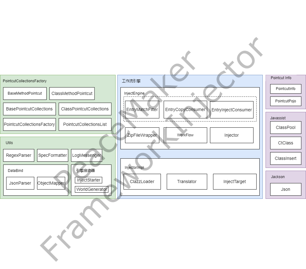 | 7 | +`FrameworkInjector` is an AOP framework for Java which is managing pointcut configurations by json and performing code weaving with `Javassist`. |