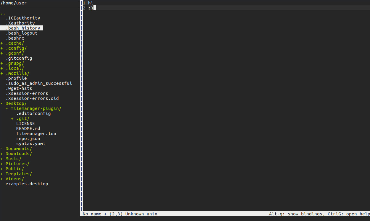 "statusformatl": "$(filemanager2.FileIcon) $(filename)$(modified)",The keybindings below are the equivalent to Micro's defaults, and not actually set by the plugin. If you've changed any of those keybindings, then that key is used instead.
