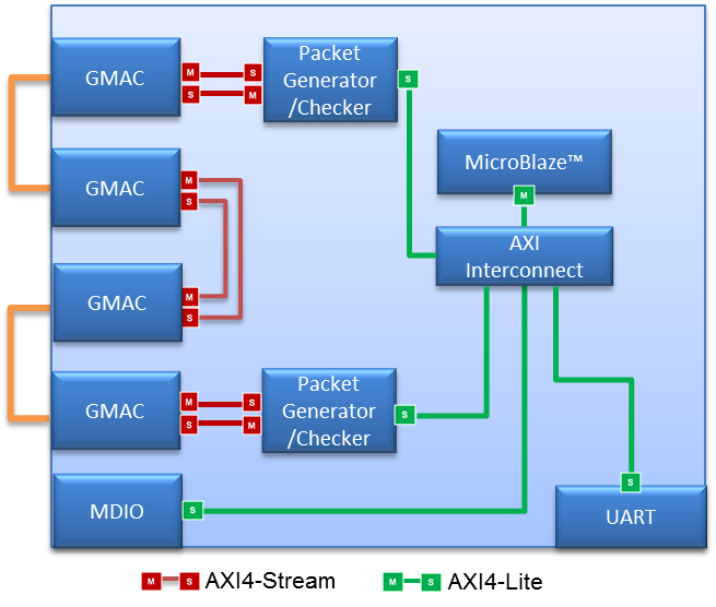 This example project shows the usage of the 1G Ethernet interfaces on NetFPGA-1G-CML board. Outside the FPGA, the interfaces are paired up using CAT-5e/CAT-6 Ethernet cables. Inside the FPGA, two packet generator/checkers are connected to two out of the four 1G interfaces while the remaining two interfaces are looped back together. MicroBlaze subsystem will poll the statistics out of the packet generator/checkers and output them through the UART interface.