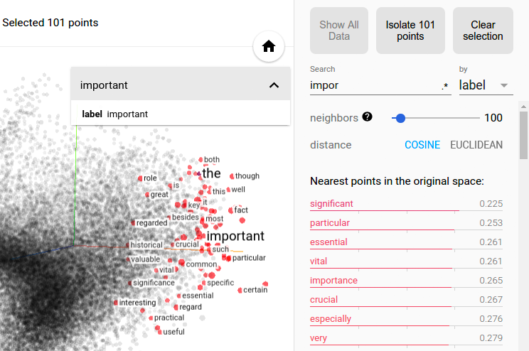 Note: in the image above, the embedding have been subsampled to a lower 3D space with a PCA (Princial Component Analysis) or t-SNE (t-distributed Stochastic Neighbor Embedding) to be explorable. This is possible with TensorBoard for inspection. 300 dimensions can't be visualised easily.