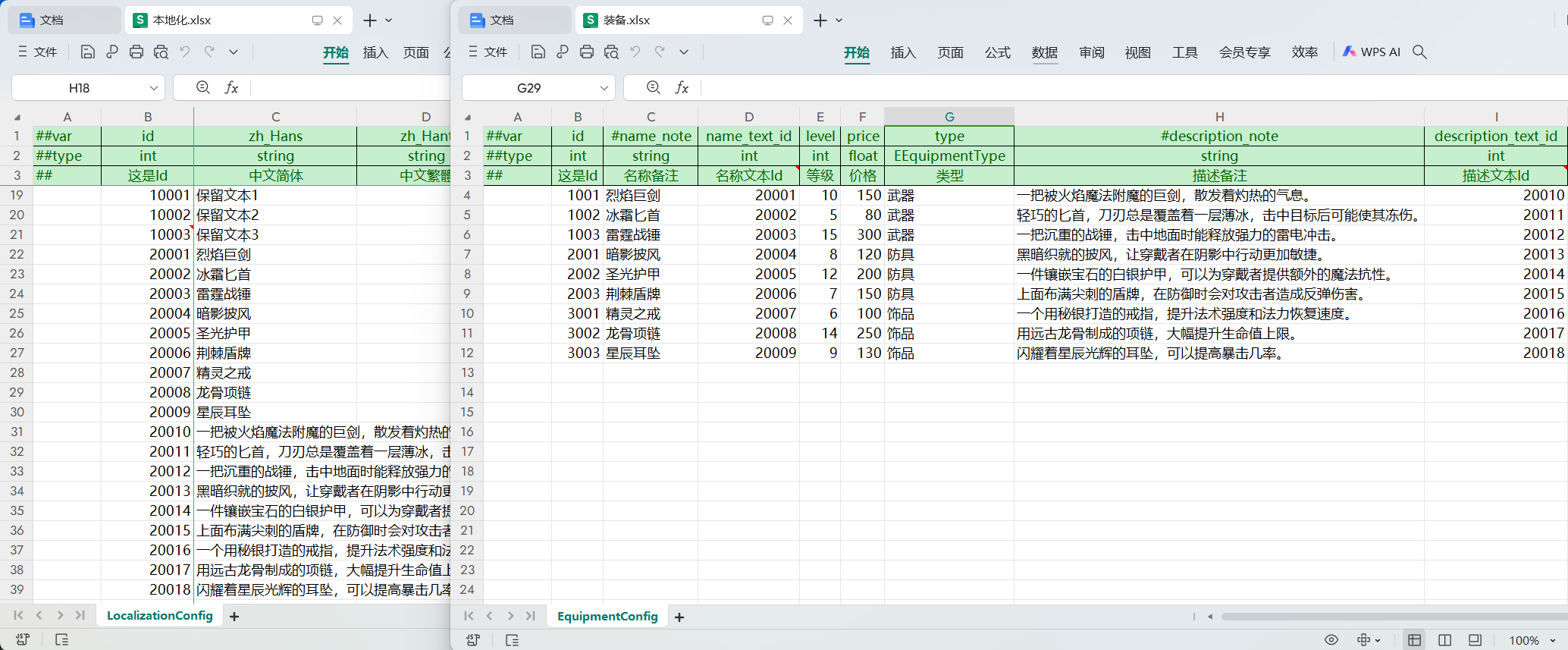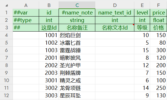 工作表命名示例:LevelConfig、Shop.ItemConfig、GlobalConfig#one、Shop.RewardConfig#list