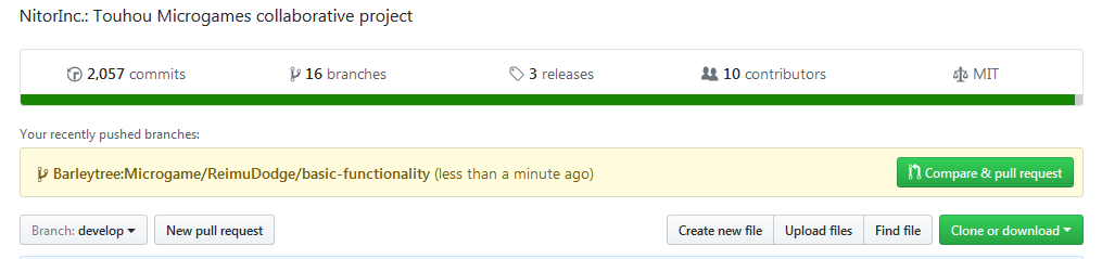Next, head over to your fork on GitHub and find your "Microgame/ReimuDodge/basic-functionality" branch. Select it.
