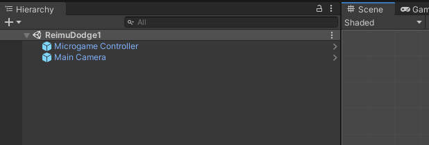 Now that we understand why it exists, open up the ReimuDodge1 scene in Unity. This will bring up the scene view for the scene along with a view of the object hierarchy. You'll notice in the hierarchy window there are two objects already in the scene: Microgame Controller and Main Camera. In Unity speak, these are GameObjects.