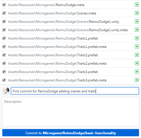 Open up to your Git program of choice (I prefer Github desktop) and, making sure you're on your newly created Microgame/ReimuDodge/basic-functionality branch, add the contents of your ReimuDodge folder and commit the new files with a short message. Remember not to commit any files that are outside the ReimuDodge folder.