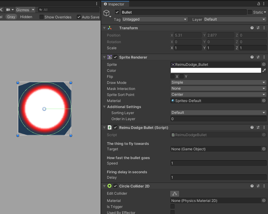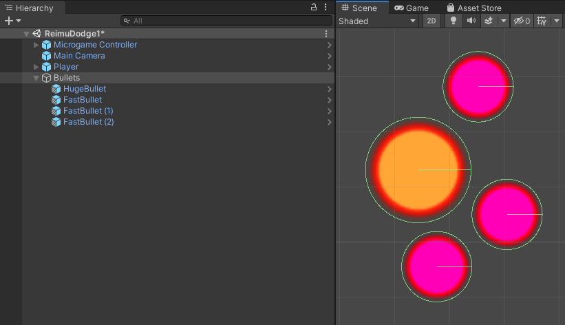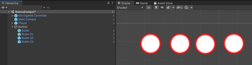 Save the ReimuDodge1 scene and, in your Scenes folder, make two copies of the ReimuDodge1 scene file named "ReimuDodge2" and "ReimuDodge3". You can use the ctr+D shortcut in Unity to duplicate files.