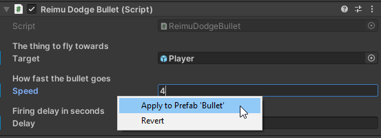Notice the "target" value of the bullet prefab is empty on this screen. This is because the target (the player) must be an object in a scene, and the bullet prefab itself doesn't belong to any scene. In other words, it should be empty because it's a value that must be assigned within a scene.