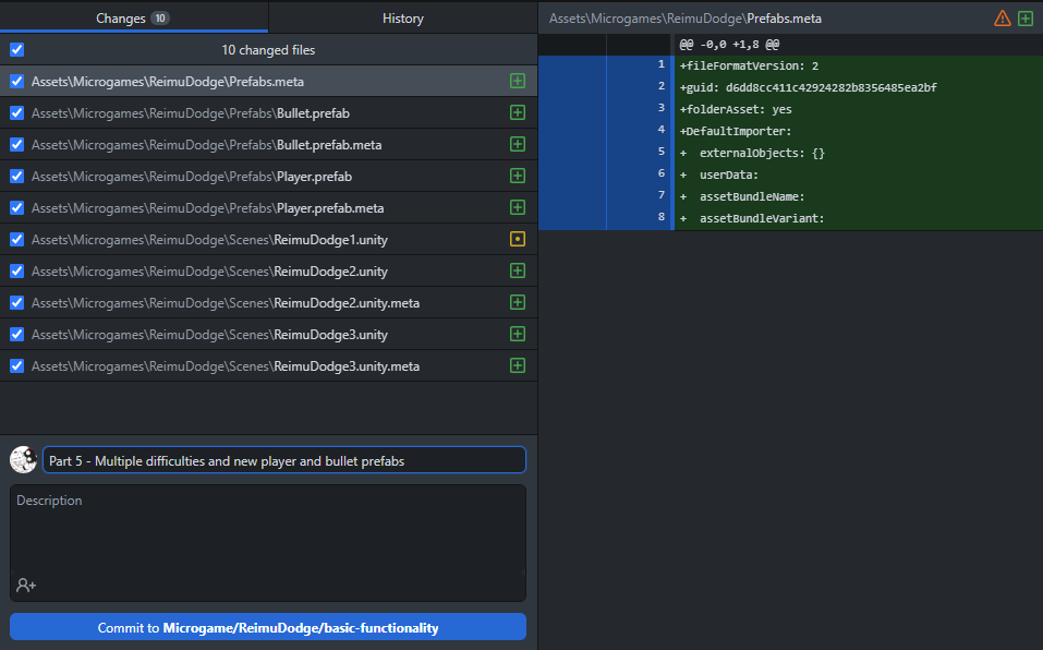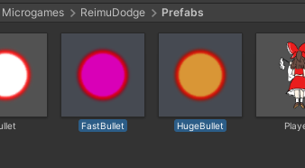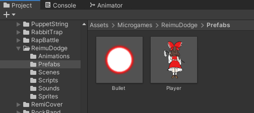 First, create a "Prefabs" folder in ReimuDodge. Then, in your scene, drag the Bullet object directly into this prefabs folder in the project window. This creates a prefab. Do this for the Player object as well.