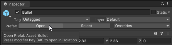 This will start prefab editing mode. Just like editing the prefab file directly, any changes you make here will apply to all copies of this prefab in your scene. This is very useful if you want to, for instance, change the speed value for all of your bullets.