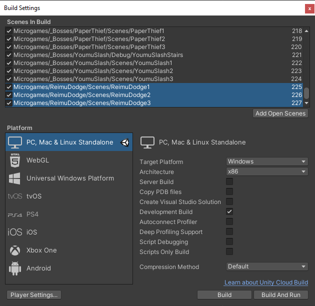 Go to File > Build Settings to open the build settings window. With the ReimuDodge1 scene open, click Add Open Scenes to add it to the end of the scenes list.
