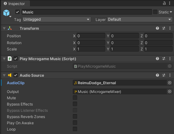 Lets add the tunes. Open up your ReimuDodge1 scene and find the Music GameObject under the Microgame Controller:
