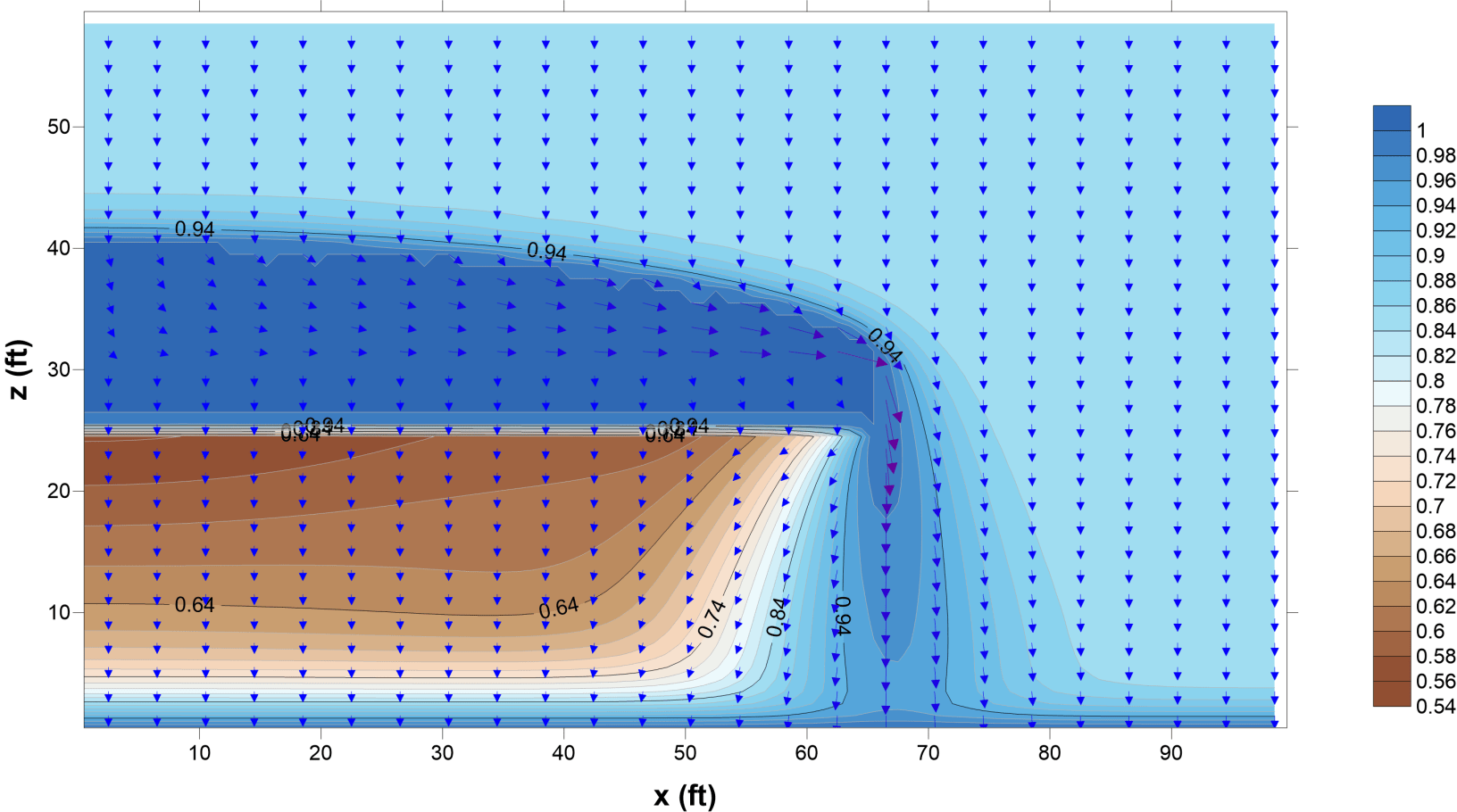 This script, written in Julia (v. 1.0 and above), solves the steady-state form of the Richards equation for variably-saturated flow in porous media in a two-dimensional vertical cross section. Model output can be used, for example, to understand the distribution of soil moisture or the formation of perched aquifers in heterogeneous soils under different types of boundary conditions. The model iteratively solves the non-linear flow problem by solving a matrix of flow-balance equations for recent-estimate values of matrix potential, then updating hydraulic conductivity values as a function of matrix potential. More information is available in my blog post, https://numericalenvironmental.wordpress.com/2018/05/26/a-steady-state-variably-saturated-flow-model-in-vertical-cross-section-a-finite-difference-approach-using-julia/.