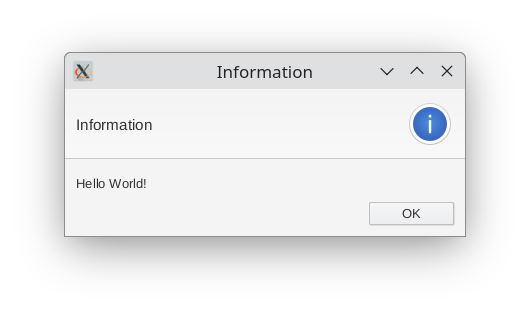 }Now, when running the program, we should get a pop-up window saying "Hello World!" instead of the previous command-line output: