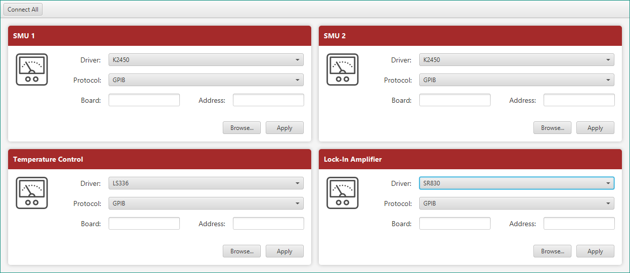 Alternatively, users can click the "Browse" buttons to see a list of all detected instruments and select from there, much like with GUI.browseVISA().